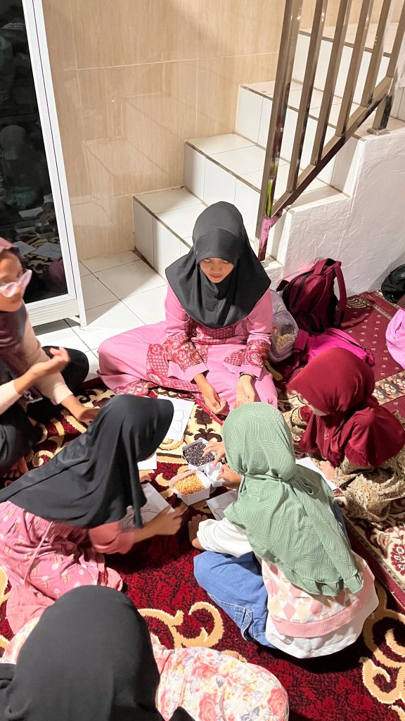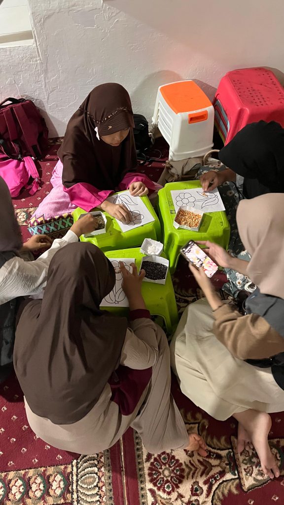 Kelas kreativitas kali ini berfokus pada kegiatan seni dan keterampilan motorik halus, yaitu menempel biji-bijian pada media gambar. Adapun gambar yang digunakan meliputi gambar kupu-kupu, bunga, nanas, dan stroberi. Biji-bijian yang dimanfaatkan sebagai bahan utama antara lain jagung, kacang hijau, dan ketan hitam.