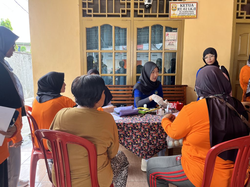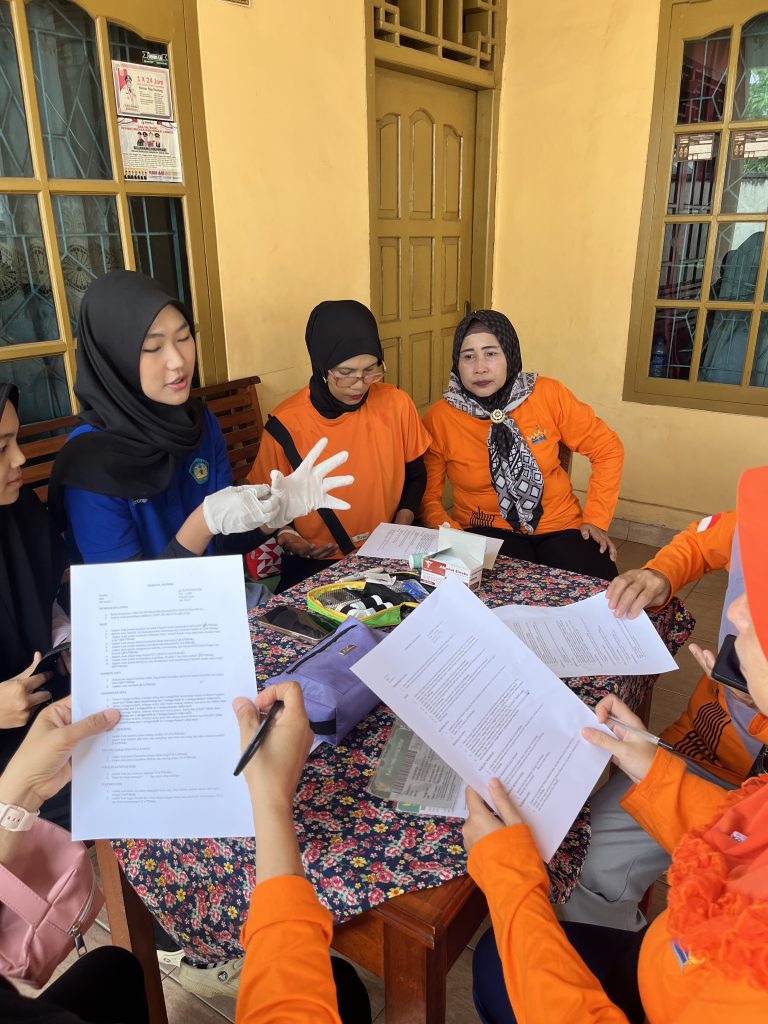 Setelah kegiatan senam pagi selesai, mahasiswa melanjutkan rangkaian kegiatan dengan pelaksanaan cek kesehatan gratis bagi masyarakat. Pemeriksaan kesehatan ini meliputi pengukuran tekanan darah dan pemeriksaan kesehatan dasar lainnya, Mahasiswa turut membantu dalam proses pendataan peserta serta memberikan edukasi singkat mengenai pentingnya menjaga pola hidup sehat. Kegiatan cek kesehatan gratis ini mendapatkan respon yang sangat positif dari masyarakat, terutama ibu-ibu dan lansia, karena memberikan manfaat langsung dalam mengetahui kondisi kesehatan mereka. Melalui kegiatan ini, mahasiswa berharap dapat meningkatkan kesadaran masyarakat akan pentingnya menjaga kesehatan secara rutin dan berkelanjutan.