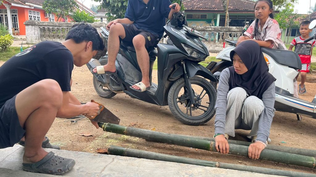 Mahasiswa KKN melanjutkan pengerjaan gapura kebun Program SINARI dengan memanfaatkan bambu sebagai bahan utama. Kegiatan yang dilakukan meliputi pemotongan bambu, perakitan rangka, serta penyesuaian ukuran agar gapura dapat berdiri dengan kokoh dan rapi. Gapura kebun ini berfungsi sebagai penanda area kebun percontohan sekaligus sebagai simbol identitas Program SINARI yang tengah dikembangkan di Desa Sindangsari.
