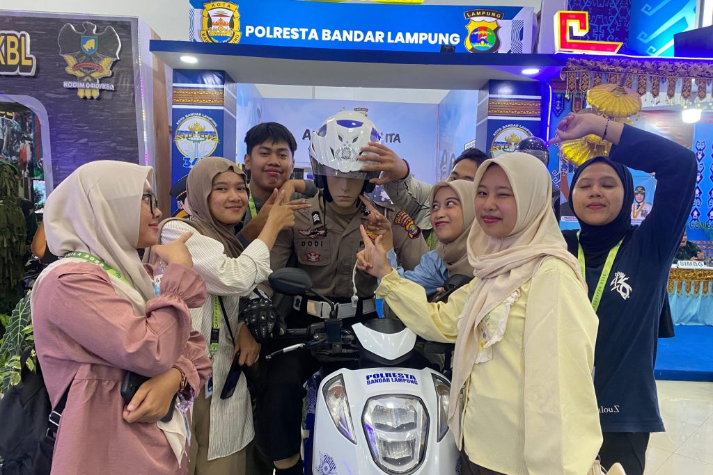 Selain itu, stand dari instansi seperti Kepolisian dan TNI juga ikut meramaikan acara dengan menyediakan spot foto bertema seragam dinas dan atribut militer, yang menarik perhatian para pengunjung. Tak kalah menarik, Dinas Perdagangan turut memamerkan dan menjual kain-kain tradisional khas Lampung, memperkenalkan kekayaan budaya lokal yang patut dibanggakan.