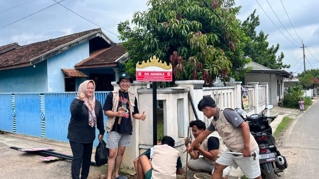Mahasiswa KKN dari kelompok Tanjung Senang melakukan langkah nyata dalam membantu ketertiban lingkungan dengan memasang plang nama jalan di sejumlah titik strategis wilayah setempat. Kegiatan yang menjadi salah satu program kerja utama ini muncul setelah para mahasiswa melihat banyaknya kurir ekspedisi maupun tamu dari luar daerah yang sering tersesat karena minimnya penunjuk jalan yang jelas. Dengan bermodalkan tiang besi kokoh dan cat yang mencolok, para mahasiswa ini bahu-membahu menggali lubang dan mengecor fondasi plang agar tidak mudah roboh atau rusak oleh cuaca. Kehadiran identitas jalan yang baru ini disambut baik oleh warga sekitar yang merasa wilayah mereka kini terlihat lebih rapi dan tertata layaknya kawasan perkotaan yang maju.