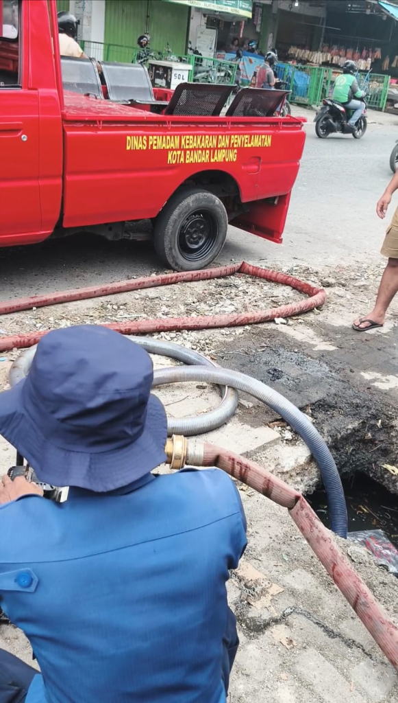 Keseriusan penanganan drainase kali ini terlihat dari durasi pengerjaan yang jauh lebih lama dan teknis yang lebih kompleks dibanding sebelumnya. Kerja sama ini menjadi sangat krusial mengingat kondisi saluran air di depan pasar sudah sangat dangkal akibat tumpukan pasir, batu, dan sampah domestik. Untuk mempermudah proses pembersihan, satu unit mobil pemadam kebakaran (Damkar) turut dikerahkan ke lokasi. Personil Damkar melakukan penyedotan air di area gorong-gorong yang tersumbat, kemudian mengalirkannya ke saluran di seberang jalan.