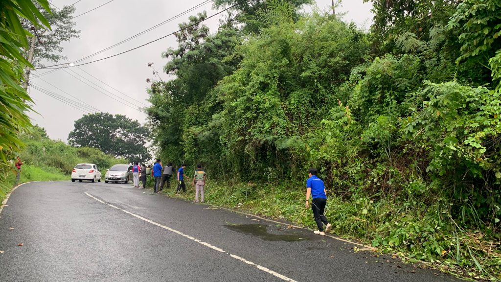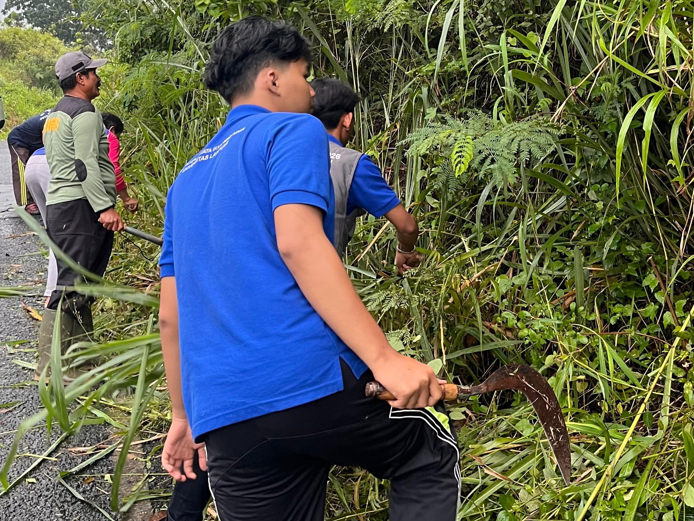 Sejak pagi hari, peserta kegiatan berkumpul di lokasi dan langsung melakukan pembersihan secara gotong royong. Area yang menjadi sasaran utama adalah sisi jalan dan lereng yang tertutup tanaman liar sehingga mengurangi kenyamanan dan jarak pandang pengguna jalan. Pembersihan dilakukan menggunakan peralatan sederhana seperti sabit dan parang, dengan membagi tugas secara alami sesuai kondisi di lapangan.