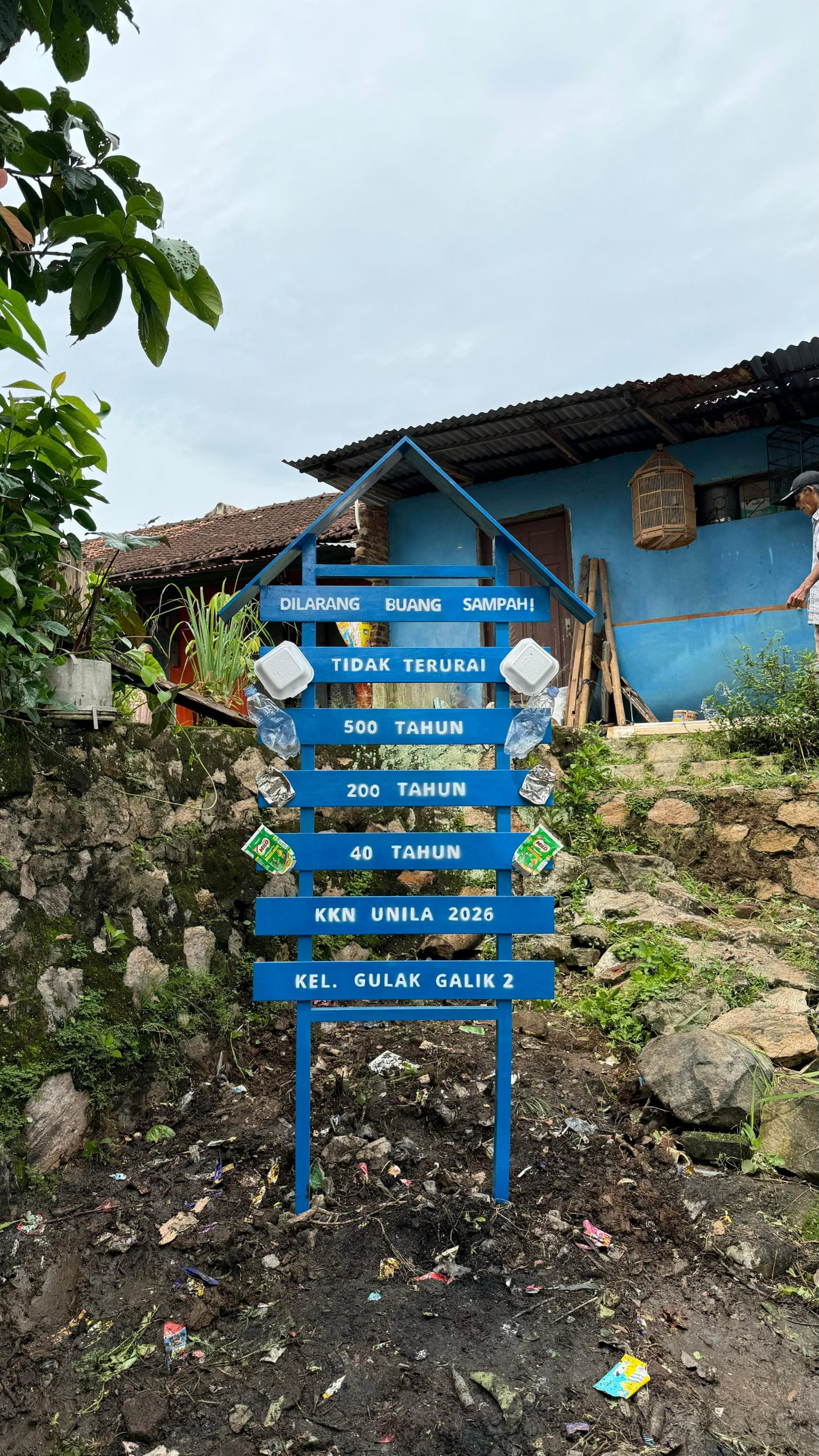 Selain kegiatan pembersihan lingkungan, mahasiswa KKN juga melakukan pemasangan plang bertuliskan “Dilarang Mem