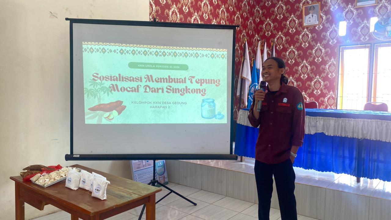Gedung Harapan, 26 Januari 2026 – Pada hari ke-19 pelaksanaan Kuliah Kerja Nyata (KKN), mahasiswa melaksanakan program kerja dengan tema One Product One Village yang bertujuan untuk menggali dan mengembangkan potensi lokal desa. Pada kesempatan ini, produk yang diangkat adalah tepung MOCAF (Modified Cassava Flour), yaitu tepung berbahan dasar singkong yang dapat menjadi alternatif tepung sehat dan bebas gluten.