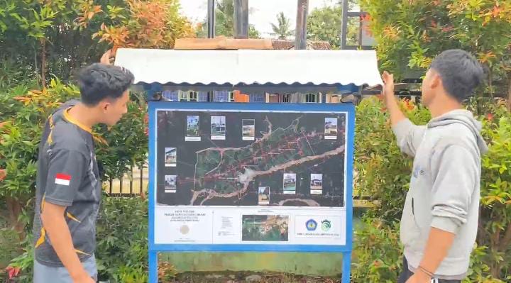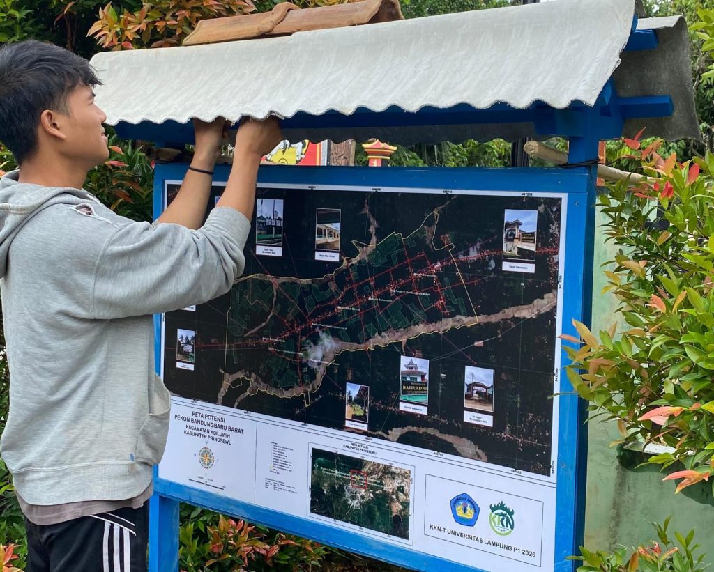 Setelah peta selesai disusun dan dicetak, mahasiswa KKN melanjutkan ke tahap pemasangan peta di area Balai Pekon Desa Bandung Baru Barat. Lokasi pemasangan dipilih agar peta dapat diakses oleh masyarakat dan aparatur desa sebagai media informasi bersama. Pemasangan peta ini menandai selesainya tahap awal program pemetaan ladang pertanian yang dirancang oleh mahasiswa KKN.