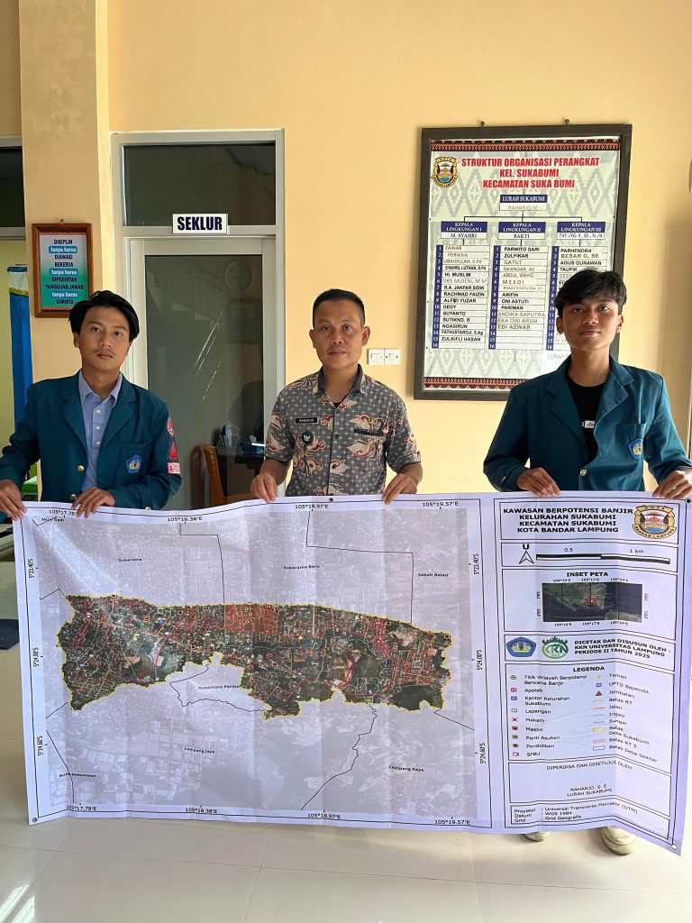 Bandar Lampung, 15 Agustus 2025 – Sebagai bentuk kontribusi nyata dan kenang-kenangan bagi masyarakat, mahasiswa Kuliah Kerja Nyata (KKN) Universitas Lampung melaksanakan penyerahan peta kawasan berpotensi banjir dan banner identitas rumah Ketua RT kepada Kelurahan Sukabumi. Peta kawasan berpotensi banjir ini dibuat untuk membantu pihak kelurahan dalam melakukan upaya mitigasi bencana, sedangkan banner identitas rumah Ketua RT diharapkan memudahkan warga maupun tamu dalam mencari lokasi rumah Ketua RT.