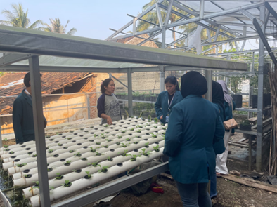 Kegiatan pertama berupa kunjungan ke kediaman Ibu Sri Handayani, Ketua Kelompok Wanita Tani (KWT) setempat. Kunjungan ini bertujuan mempererat tali silaturahmi sekaligus berdiskusi mengenai berbagai kegiatan yang selama ini dijalankan KWT. Dalam pertemuan singkat tersebut, Ibu Sri Handayani memaparkan bahwa KWT memiliki sejumlah agenda rutin, mulai dari pengelolaan kebun bersama, pelatihan bercocok tanam, hingga pengolahan hasil pertanian menjadi produk bernilai tambah.