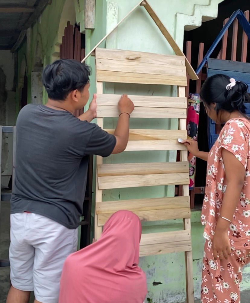 Proses pembuatan papan informasi untuk sampah dikerjakan secara kolektif di sekitar posko KKN. Tampak mahasiswa sangat aktif dalam merakit dan menyusun kayu menjadi papan yang teratur dan kuat. Beberapa di antara mereka bertugas untuk menahan dan mengatur posisi papan, sementara yang lain fokus pada pengukuran, penulisan, serta perakitan. Kerja sama yang solid di antara anggota kelompok sangat mendukung kelancaran dalam pembuatan papan informasi tersebut.