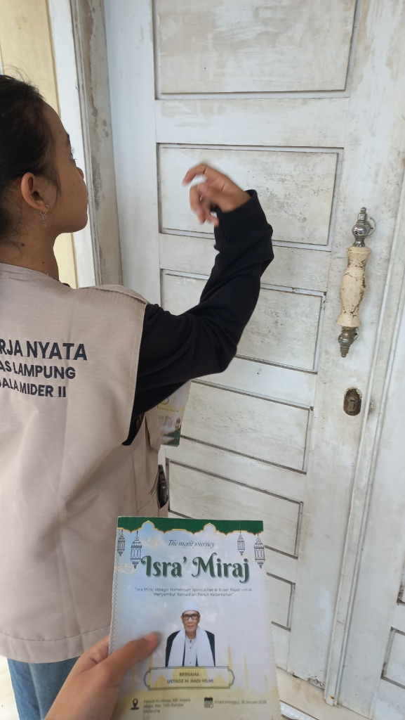 16 Januari 2026 – mahasiswa KKN Segala Mider 2 melaksanakan kegiatan persiapan program kerja peringatan Isra Mi’raj yang akan diselenggarakan di Masjid Al Abas. Kegiatan ini diawali dengan koordinasi antara mahasiswa KKN dengan pengurus masjid dan panitia setempat guna memastikan kesiapan pelaksanaan kegiatan. Setelah koordinasi dilakukan, mahasiswa mulai menyebarkan poster informasi kegiatan di lingkungan sekitar serta membagikan undangan kepada masyarakat secara langsung.