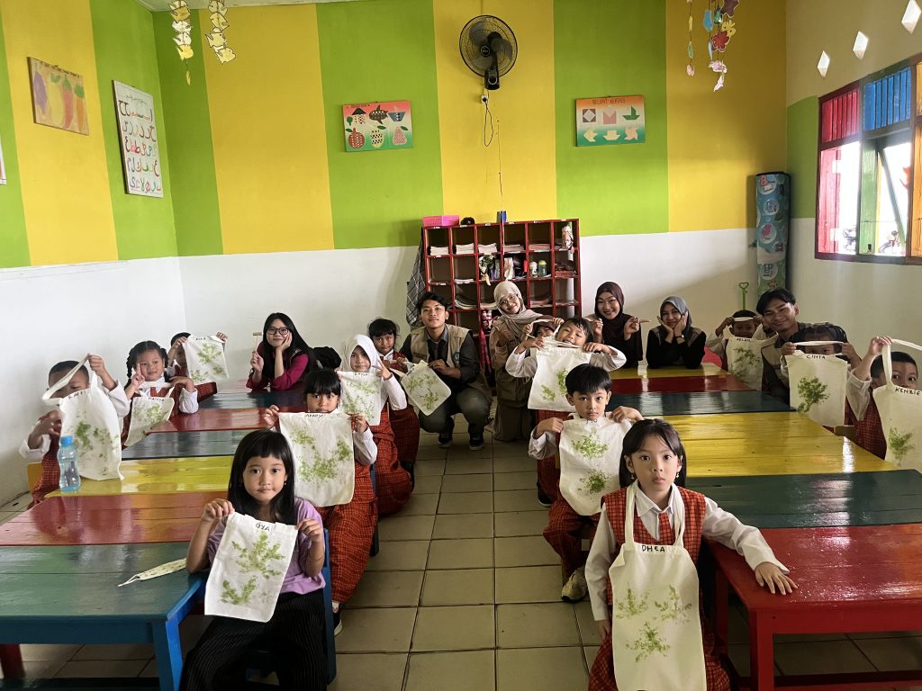 Pemilihan kegiatan eco print pada tote bag didasarkan pada konsep ramah lingkungan dan kemudahan penerapannya bagi anak-anak. Eco print merupakan teknik mencetak motif alami pada media kain dengan memanfaatkan daun dan bunga yang ada di sekitar lingkungan sekolah. Selain memperkenalkan pemanfaatan bahan alam, penggunaan tote bag juga bertujuan untuk menanamkan kebiasaan mengurangi penggunaan kantong plastik sejak dini serta mengenalkan produk yang dapat digunakan dalam kehidupan sehari-hari.