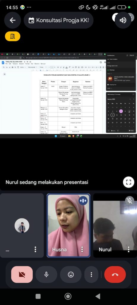 Kelurahan Sukajawa Baru, 7 Januari 2026 — Mahasiswa Kuliah Kerja Nyata (KKN) Universitas Lampung melaksanakan rapat koordinasi secara daring melalui aplikasi Zoom pada Rabu, 7 Januari 2026, pukul 14.10–15.00 WIB. Kegiatan ini dilakukan sebagai bagian dari persiapan dan pemantapan program kerja yang akan dilaksanakan di Kelurahan Sukajawa Baru.