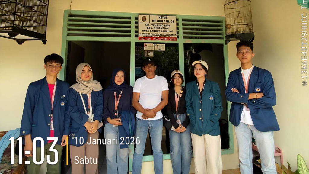 Bandar Lampung, 10 Januari 2026 — mahasiswa Kuliah Kerja Nyata (KKN) Universitas Lampung yang bertugas di Kelurahan Tanjung Raya, Kecamatan Kedamaian melaksanakan kegiatan silaturahmi dan koordinasi dengan para Ketua RT di wilayah Lingkungan I dan Lingkungan II Kelurahan Tanjung Raya. Kegiatan ini dilaksanakan dengan cara berkeliling wilayah kelurahan dan mengunjungi langsung kediaman Ketua RT setempat.