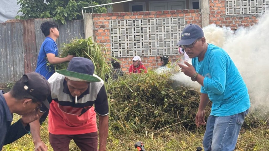Selanjutnya, kegiatan dilanjutkan dengan dokumentasi sebagai arsip kegiatan, kemudian dilakukan kerja bakti bersama warga sekitar, baik ibu-ibu maupun bapak-bapak. Kegiatan kerja bakti meliputi pembersihan lahan dengan menggunakan berbagai peralatan seperti arit dan mesin pemotong rumput. Suasana gotong royong terasa sangat kental, di mana seluruh peserta kegiatan saling bahu-membahu membersihkan area lahan. Di sela-sela kegiatan, warga dan mahasiswa juga menikmati camilan serta minum kopi bersama, sambil mengobrol santai dan mempererat hubungan kekeluargaan.