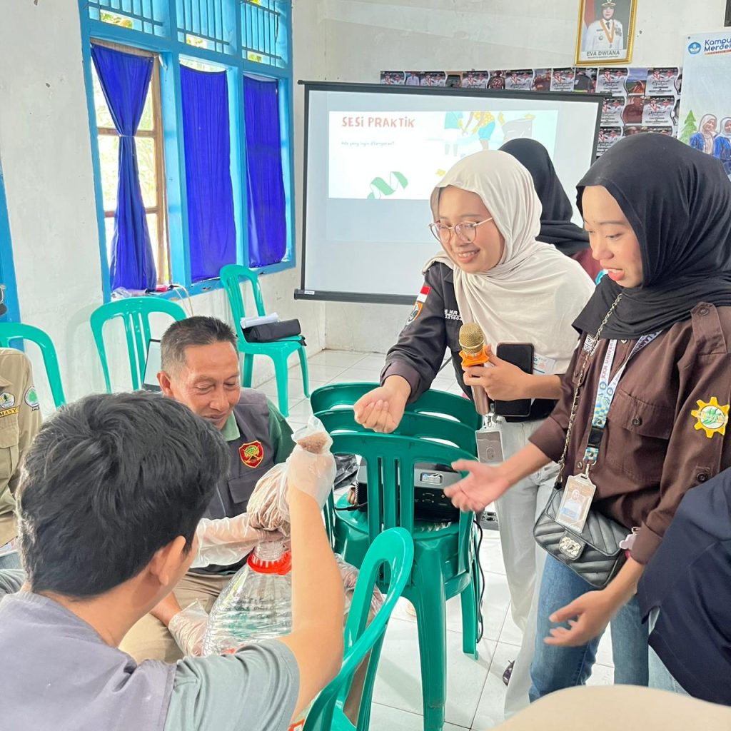 Setelah penyampaian teori selesai, kami langsung masuk ke sesi praktik bersama warga menggunakan wadah galon berkapasitas 15 liter. Kami mempraktikkan langsung perbandingan bahan yang tepat antara air, gula merah, dan kulit jeruk sesuai dengan rumus yang sudah kami siapkan. Warga yang hadir terlihat cukup antusias menyimak langkah demi langkah, mulai dari pemotongan bahan sampai cara penyimpanan galon fermentasi yang benar.