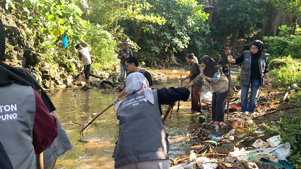 Bandar Lampung, 6 Agustus 2025 – Menindaklanjuti informasi dari Lurah Kedaton pada 5 Agustus 2025 terkait penumpukan sampah kiriman yang menyebabkan luapan air sungai dan genangan di beberapa rumah warga Lingkungan 2, Tim KKN Universitas Lampung bersama aparat Kelurahan Kedaton melakukan aksi nyata melalui kegiatan Grebek Kali.