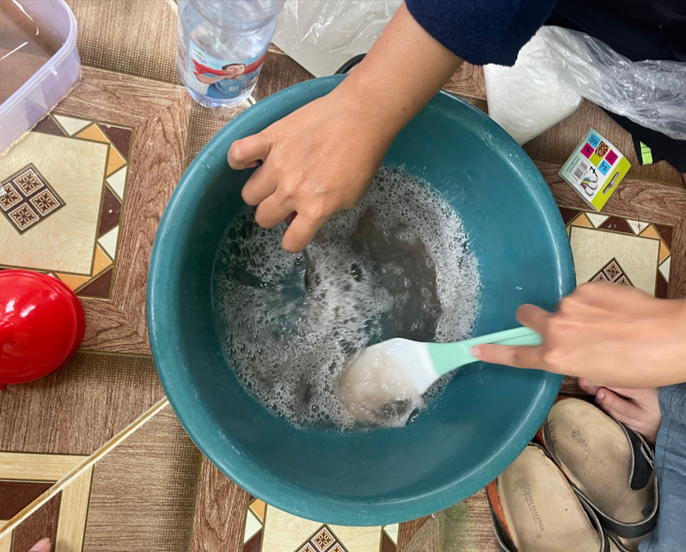 Uji coba difokuskan pada proses pengolahan limbah kulit pisang menjadi bahan yang dapat dimanfaatkan sebagai campuran sabun, serta penyesuaian takaran bahan agar menghasilkan produk yang efektif dan aman digunakan. Mahasiswa juga mengevaluasi tekstur, daya bersih, dan tingkat busa sabun sebagai bagian dari tahap penyempurnaan.